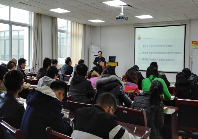 (通讯员 邹晶晶)2016年11月10日下午15:00,院党总支书记孙绍发院长以“聚焦全面从严治党——学习贯彻党的十八届六中全会精神”为题,在yl8cc永利官网202会议室讲党课。院全体党员老师和部分学生干部共计100多人聆听了报告。