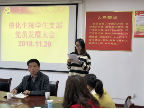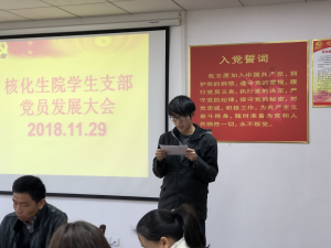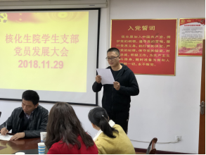2018年11月29日下午3:00,yl8cc永利官网学生支部党员发展大会在核化生院二楼会议室隆重举行。大会由学生支部书记周皎石同志主持,参加本次大会有学院党支部副书记张规富同志及陈志远等26名党员。