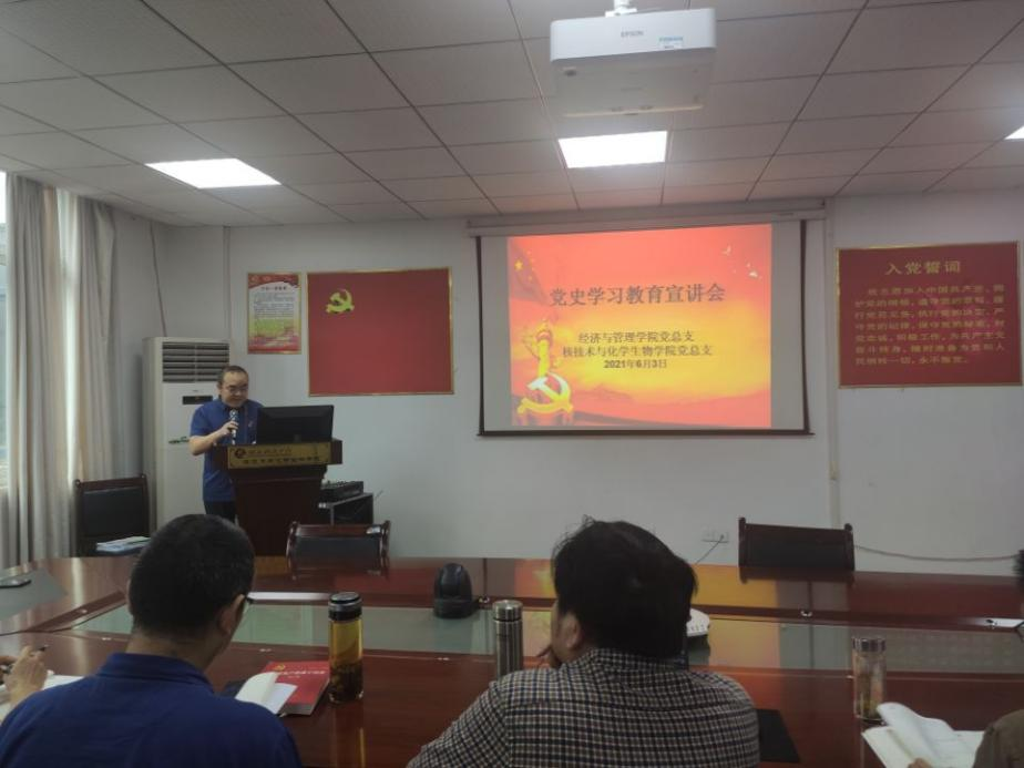 通讯员 陈钇江 为了从党的百年历史中汲取继续前进的智慧和力量,深入学习贯彻习近平中国特色社会主义思想,贯彻落实党中央关于党史学习教育的相关文件精神,6月3日下午,核技术与化生生物学院党总支和经济与管理学院党总支全体教工党员共60余人在核化生院二楼会议室召开党史学习教育宣讲会,会议由核化生院党总支常务副书记张规富主持。
