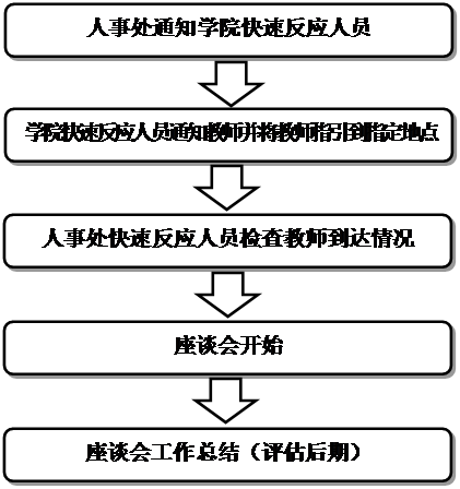 3、人事处接到专家组抽调教师进行座谈会的名单后,由指派的专门人员立即联络教师所在学院专门负责教师座谈会的工作人员,学院工作人员立刻联系到教师本人,提前30分钟将教师指引到座谈地点。