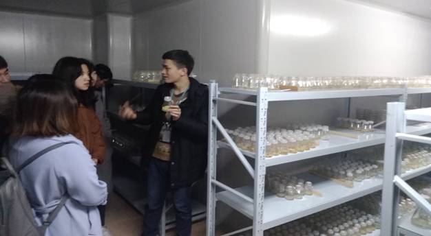 天问公司负责人是30岁左右的青年凌先生,通过凌先生的介绍,同学们了解了植物组织培养的一些基本操作和一些实验仪器。他们先参观了暗培养的水稻种子,橙黄的胚铺在选择培养基上,经历植物激素的刺激脱分化,再分化。以完成蜕变,成长为一棵完整的植株。明亮的光照培养室里的是已初具完整形态的转基因棉花。幼嫩的叶茁壮的撑起了培养瓶的小小天地。
