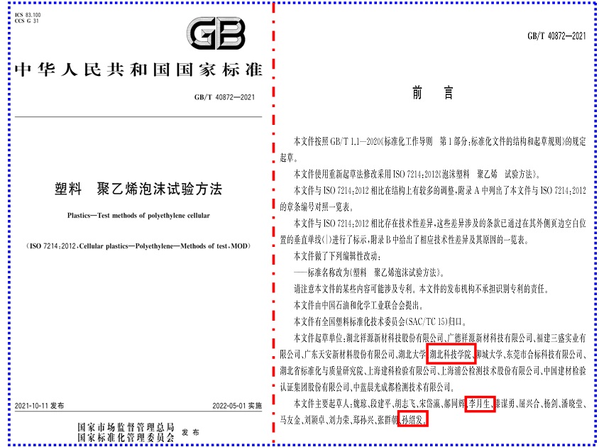 (通讯员 杨小洁 )近日,由yl8cc永利官网院长孙绍发教授、非动力核技术研发中心李月生教授,共同参与起草的国家标准《塑料 聚乙烯泡沫试验方法》(标准号:GB/T 40872-2021),经过3年的努力,顺利通过专家审定,并由国家市场监督总局和国家标准化管理委员会于2021年10月11日联合发布,将于2022年05月01日起在全国正式实施。这是我校建校以来获批的第一个国家标准,实现了我校无国家标准的零的突破!