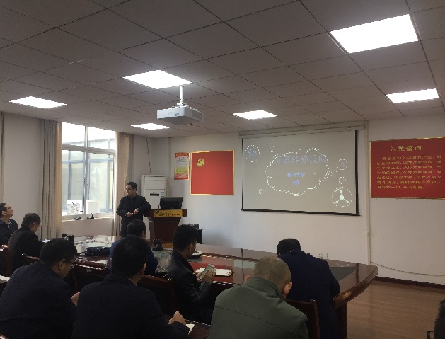 交流会伊始,朱晓明教授对张明教授等专家的到来表示热烈欢迎,并简要介绍了专家的基本情况。随后,张明教授就先配位后聚合的方式制备键合型稀土功能化材料,以解决稀土分散性问题并维持材料的光学吸附性,作了题为《新型防辐射高分子透明材料性能介绍》的学术报告,重点对含钆有机玻璃等中子辐射屏蔽透明材料进行了深入浅出的讲解。俞磊教授从化工反应涉及的元素转移过程,作了题为《元素转移反应》的学术报告,阐述了其“元素转移反应”理念形成的过程,并着重介绍了从廉价硒源将硒元素高效率地引入到目标产物中的硒转移过程及相关富硒产品的具体应用。