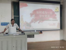 2022年9月5日下午,yl8cc永利官网在3-301举办2022级新生入学教育讲座,讲座由学生第二支部书记吴静婷主讲,主题是“如何成为一名学生党员——《中国共产党发展党员工作流程解读》”。