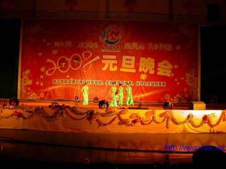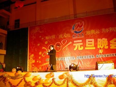 2008年元旦日晚,我系与资环学院、生物医学工程系三系联合举行了主体为“庆元旦、师生情、迎奥运、共享和谐”的元旦晚会。院纪委书记韩斌华教授、院团委书记毛晔老师,资环学院院长刘成武教授、生物医学工程系主任邹卫东教授、化学与生命科学系主任孙绍发教授以及三院系的部分教师到会观看了晚会。整个晚会现场气氛热烈,精彩纷呈,同学们热情精彩的表演博得了观众的阵阵掌声,把晚会不断推向高潮。晚会由化学与生命科学系主任孙绍发老师致辞。